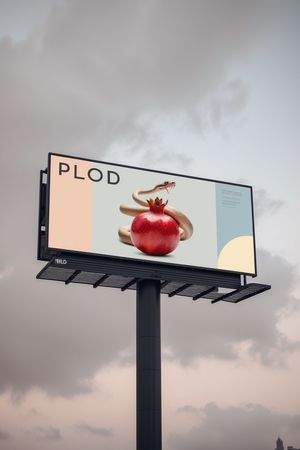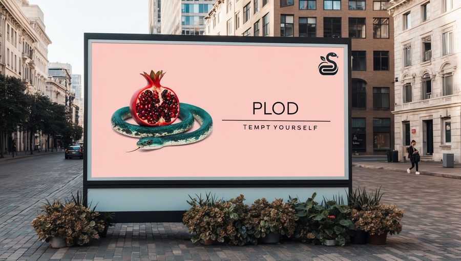 Model: Leonardo AI Prompt: urban billboard in pastel colours with a minimalistic image of snake with pomegranate, the logo «PLOD» and words «tempt yourself» Preset: minimalist