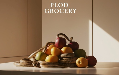 Plod grocery store — переосмысление моего проекта про торговую сеть фруктов. Пастельные тона погружают зрителя в спокойную атмосферу Эдема, а изображение змей отсылает к истории Адама и Евы, соблазнившихся спелым плодом.
