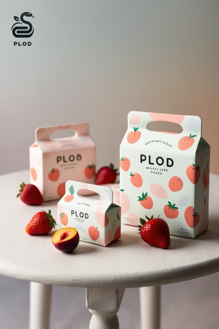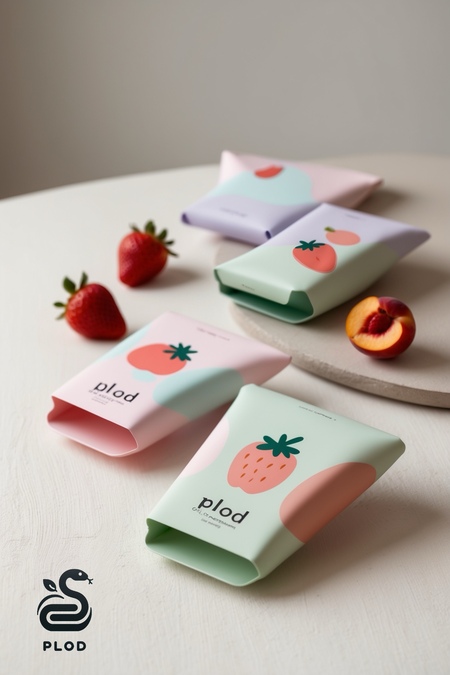 Model: Leonardo AI Prompt: packages for fruits in minimalistic style for a grocery called «PLOD» with a fruit print in a pastel palette Preset: minimalist