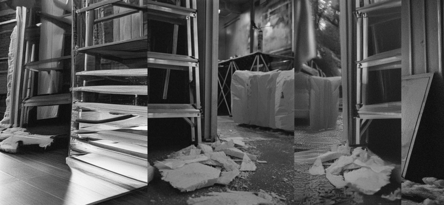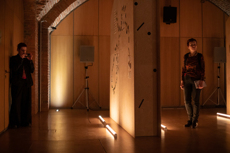 Выставка-концерт проходила на -1 этаже Центра художественного производства «Своды» 23 апреля. Для экспозиции визуальных работ были выбраны две выставочные конструкции, которые находились в наиболее отдаленной части прохода. На каждой выставочной конструкции помимо работ был наклеен черный оракал с различными формами.