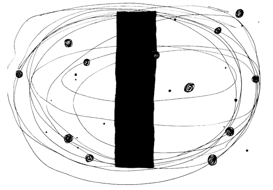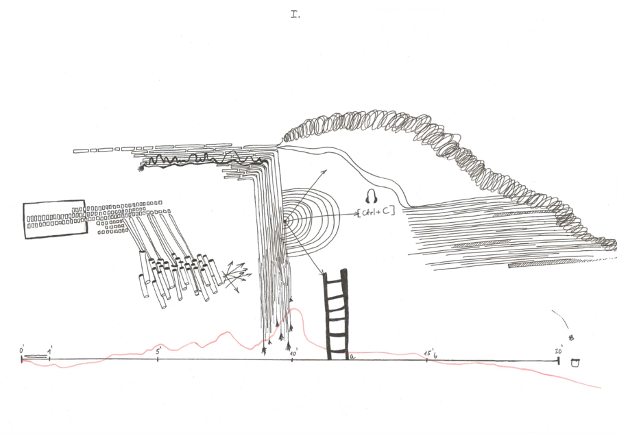 Каждый из перформеров отвечает за явление в иллюстрации — чтобы понять, кто от чего отталкивается, можно провести перпендикуляр от начала элемента в партии вверх до самой иллюстрации и тем самым найти начало элемента в графике.