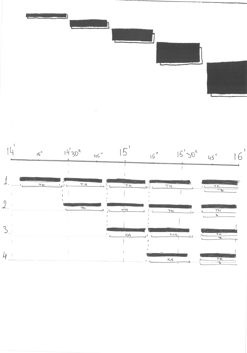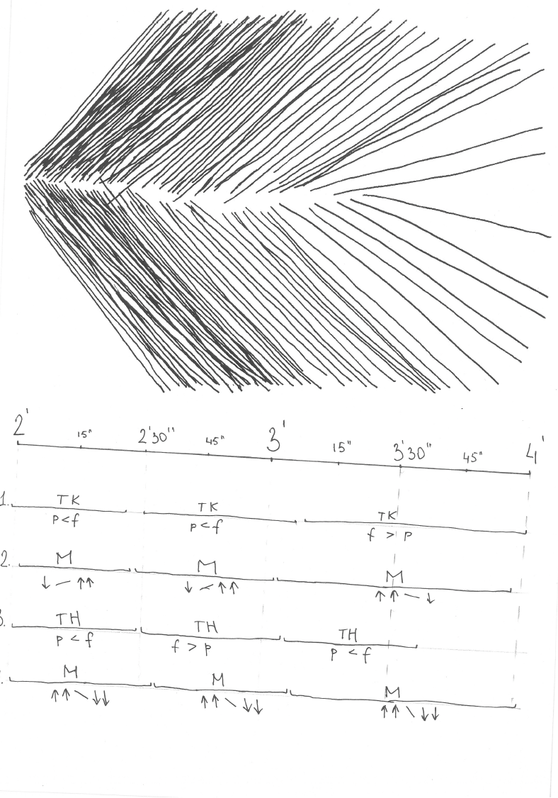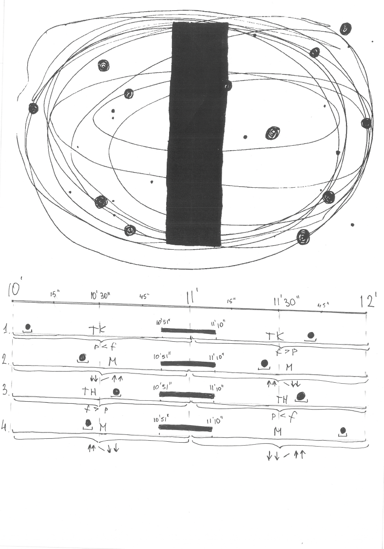 Каждый из перформеров ведет свою партию, ориентируясь на время и специальные обозначения, выписанные перед началом композиции.