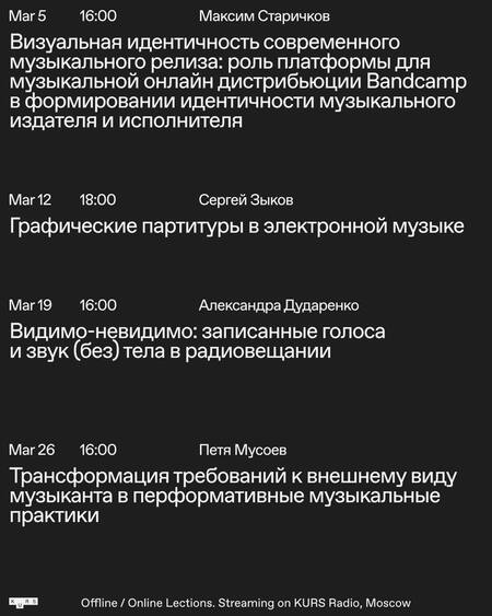 Параллельная программа представляла из себя серию образовательных лекционных передач на независимом онлайн радио KURS radio под названием что слышим, что видим. Весь март по средам ведущие говорили об аспектах, стоящих вокруг музыки и звука.