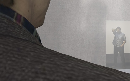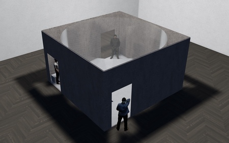 В пространстве галереи «Бомба» есть недоступная комната, вход в которую огорожен сеткой. По техническим причинам она закрыта к посещению. На месте дверных проемов, через которые посетители могли бы заглянуть в комнату, установлены двери с несколькими глазками. За каждым глазком скрыт экран, транслирующий изображение пространства выставки в реальном времени.