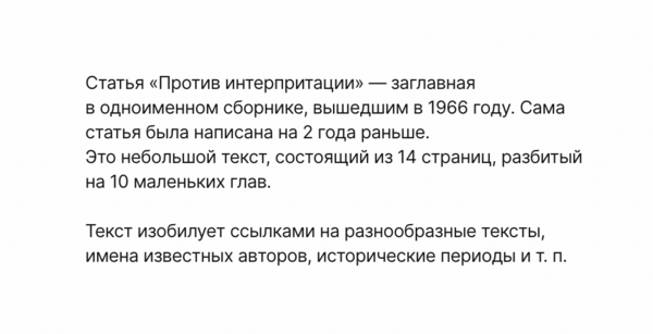 5. Акцент на содержании порождает постоянный, никогда не завершающийся труд интерпретации. И наоборот — привычка подходить к произведению с целью его интерпретации поддерживает иллюзию, будто и в самом деле существует такая вещь, как содержание произведения искусства.