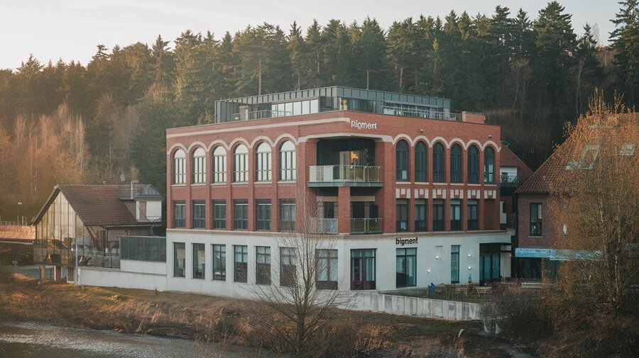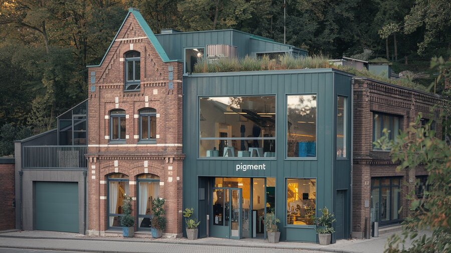 Prompt: building for the brand of eco paints for artists «Pigment» in the style of an old brick building but renovated and with modern elements 2 floors. It is embedded in the surroundings of the city on the edge of a forest