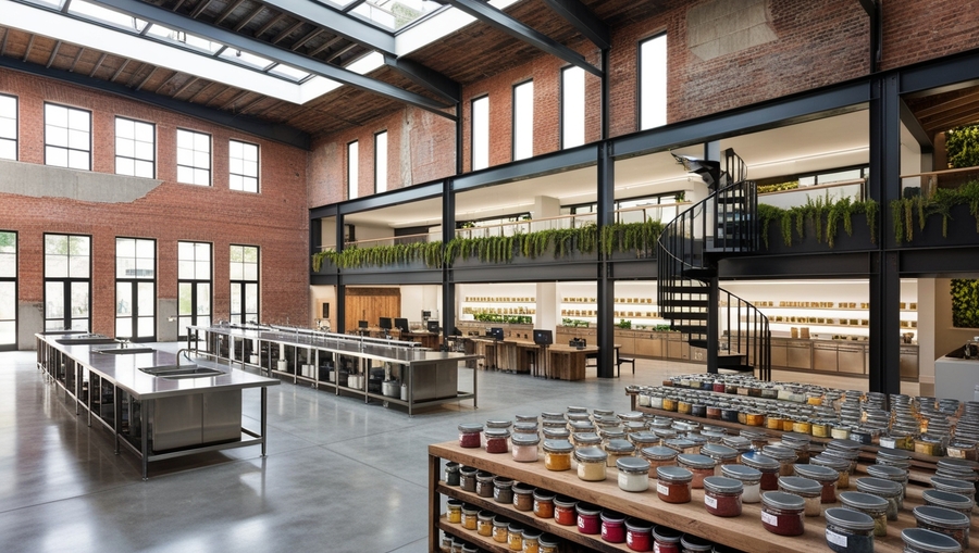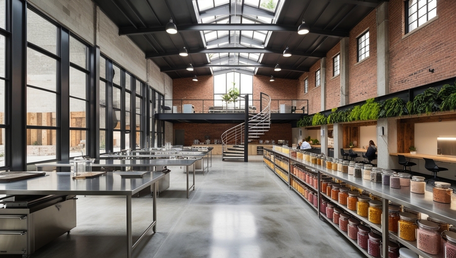 Prompt: Production hall for the brand of eco paints from natural ingredients for artists «Pigment» in the style of an old brick building but renovated and with modern elements 2 floors.