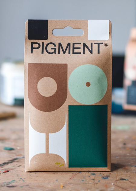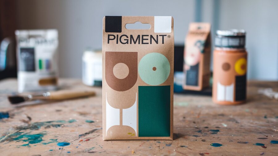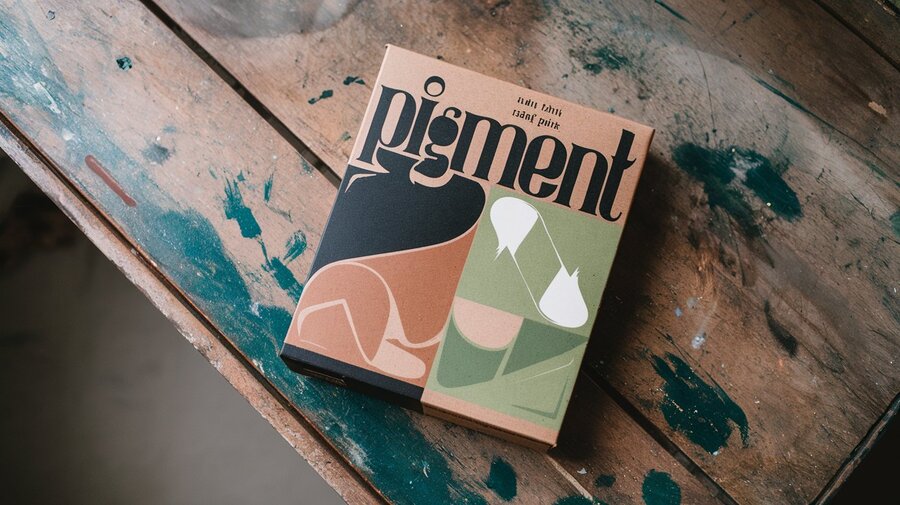 Prompt: packaging of art paint brand eco paint for artists «Pigment» which lies on a wooden table stained with paint and shabby. the packaging itself is made of kraft cardboard and design in black, lite brown, green and white color