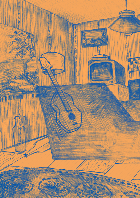Итог проделанной работы — графическая серия из трех интерьерных рисунков, посвященных комнате, сконструированной на основе творчества и личности режиссера Алексея Балабанова