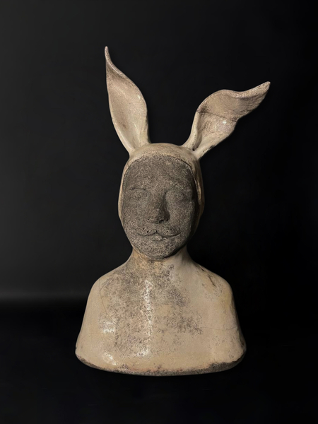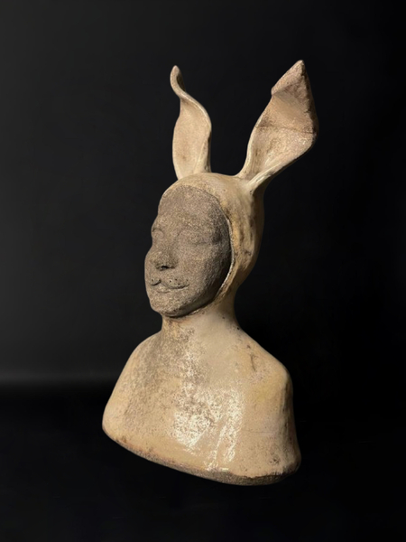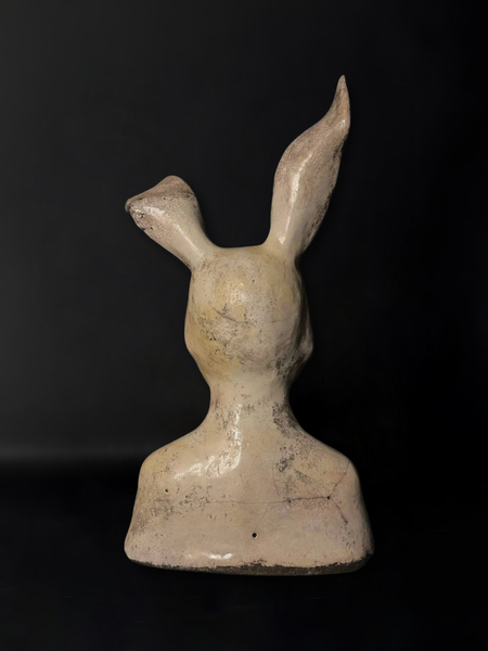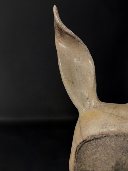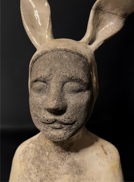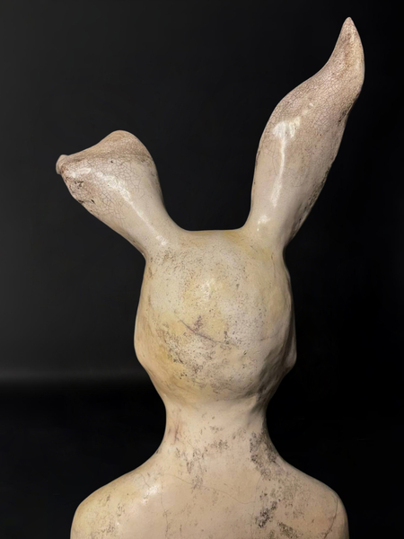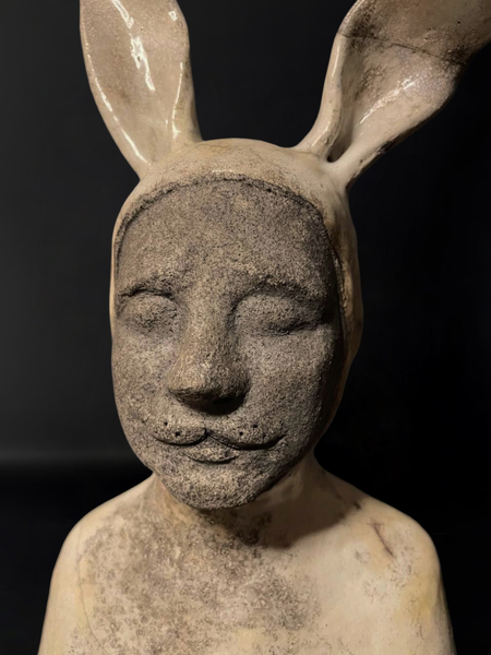 Скульптура, изображает застывший момент трансформации — фигуру человека, сливающуюся с образом кролика. Контраст матовых и глянцевых поверхностей, пронизанных паутиной кракле, создаёт ощущение хрупкости грани между двумя сущностями. Техника Раку с её непредсказуемыми эффектами обжига подчёркивает двойственность работы. Чёрный и белый — не просто цвета, а символы противоположностей, которые сосуществуют в одном теле. Образ кролика здесь лишён сказочности — это скорее архетип, медитация на тему идентичности. Костюм не скрывает человека, а становится его частью, как в древних ритуалах, где маска не прячет лицо, а раскрывает истинную природу носителя.