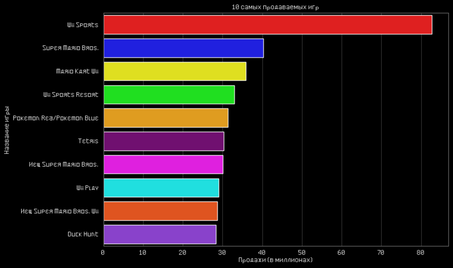По графику видно, что одной из самых продаваемых игр на тот момент стала WII Sports, она совмещала не только игровую, но и спортивную часть, которая привекла множество игроков.