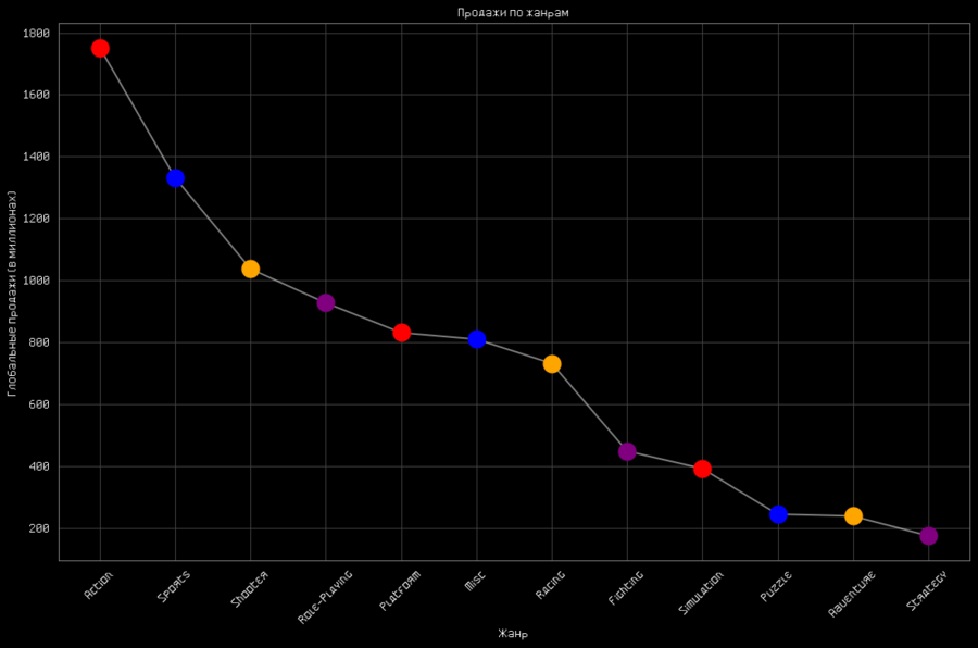 Смотря на датасет, я заинтересовался, какой из жанров является самым популярным в играх. Им стали экшен игры, что неудивительно, самым же не популярные стратегии.