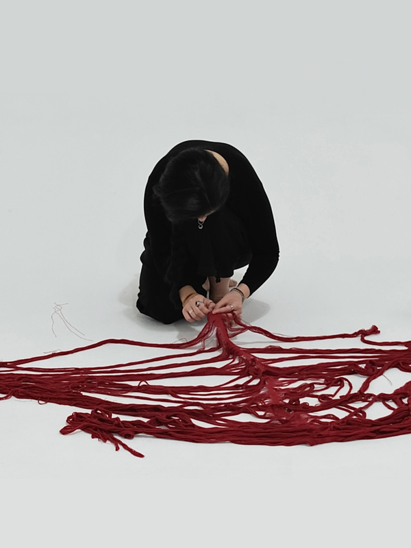 В этой работе я беру постельное белье, оставшееся после отношений и распускаю ткань на нити, которые соединяются в клубок. Это медитативное действие стало рассуждением на тему взаимоотношений между людьми, также в проекте переосмысляется сам материал.