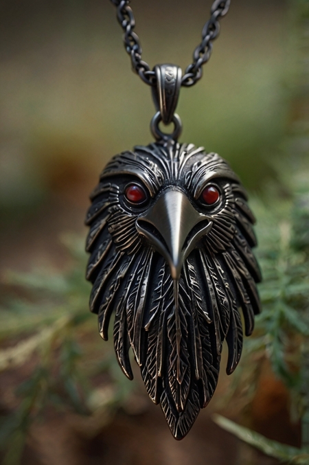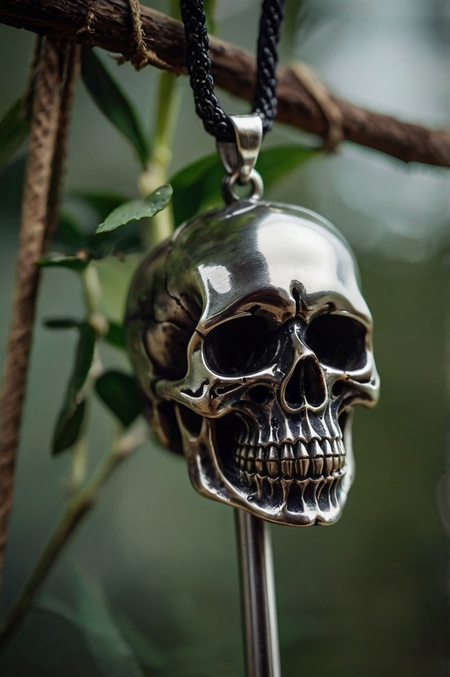 Prompt: Necklace in shape of smooth skull on a metall stick. Preset: Cinematic Kino, Preset Style: Cinematic, Contrast: High