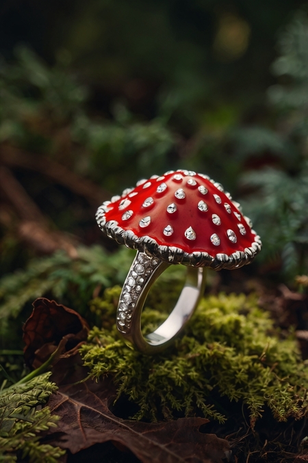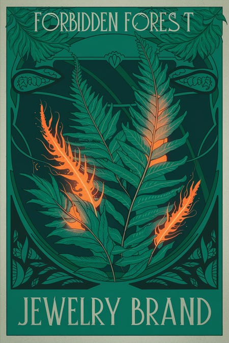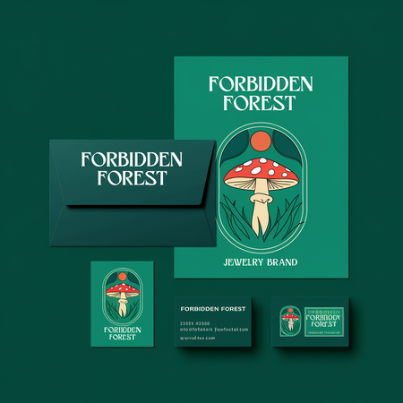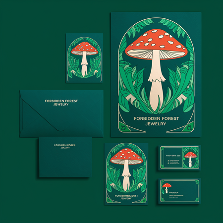 Magic Prompt: A logo for «Forbidden Forest» with the text «Jewelry Brand». The logo is in the Art Nouveau style. There’s a fly agaric mushroom with a red cap and white spots.