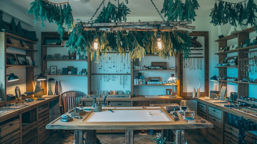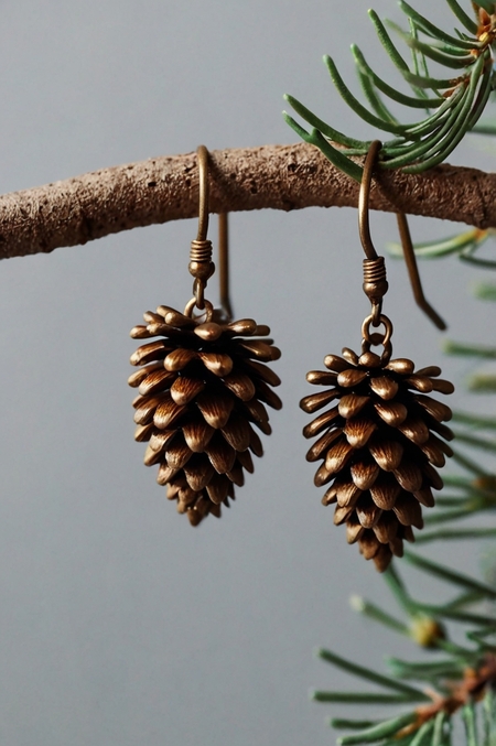 Magic Prompt: A mockup of a paper bag on a dark green background for the Forbidden Forest jewelry brand. The bag is open, revealing a pair of earrings shaped like crows perched on branches. The earrings are gold with dark green enamel. The background is a dark green rectangle.