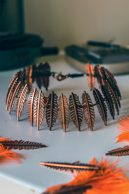 Magic Prompt: A photo of a necklace made of metal orange feathers. The necklace has a clasp and is placed on a white surface. There are some orange feathers scattered around the necklace. The background is blurred and consists of a beige wall and a few items. Color palette: Ember, Style: Realistic *Edited with Photoshop (colors)