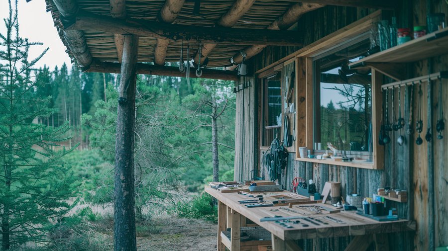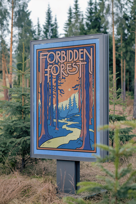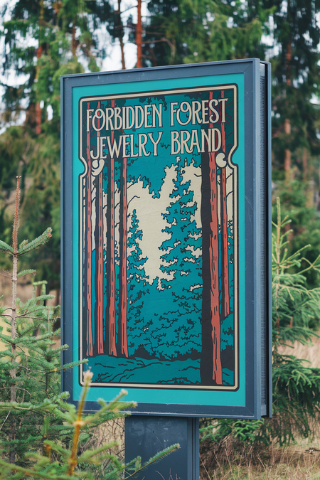A photo of a billboard in a spruce forest with a mockup of an Art Nouveau poster for the «Forbidden Forest» jewelry brand. The poster features a spruce forest with tall trees and a winding path. The text «Forbidden Forest» is written in a flowing script at the top. The poster is placed on a billboard in the spruce forest. Color palette: Fresh, Style: Design * Edited with Photoshop (colors)
