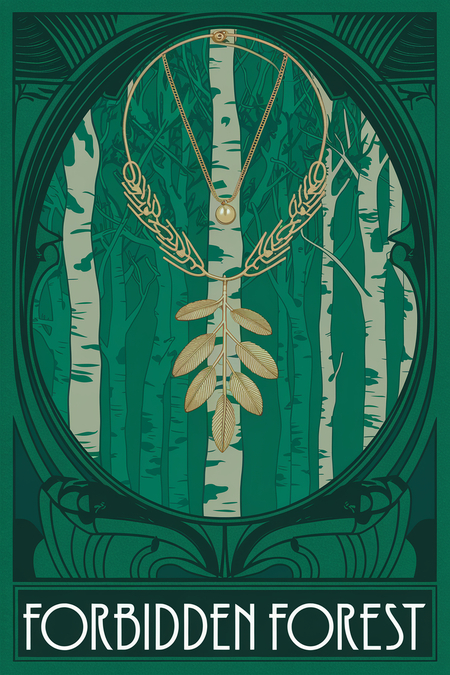 Magic Prompt: A mockup of a box with the text «FORBIDDEN FOREST» in an art nouveau style. The box is placed on a dark green background. The box is adorned with spruce branches. The overall design has a nature-inspired theme.