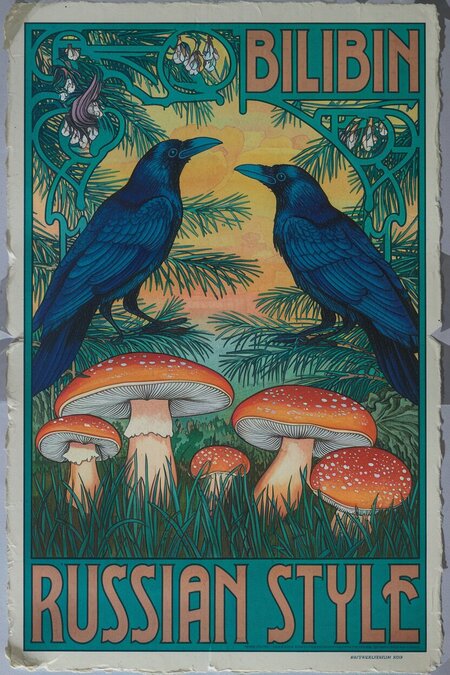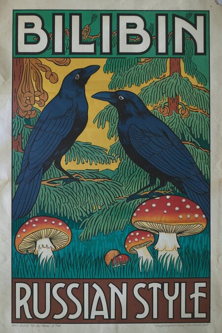Magic Prompt: A photo of a breathtaking art nouveau advertising poster for BILIBIN jewelry. The poster features black crows, spruce trees, and fly agaric mushrooms. The poster is printed on high-quality paper. The text «RUSSIAN STYLE» is written in bold letters.