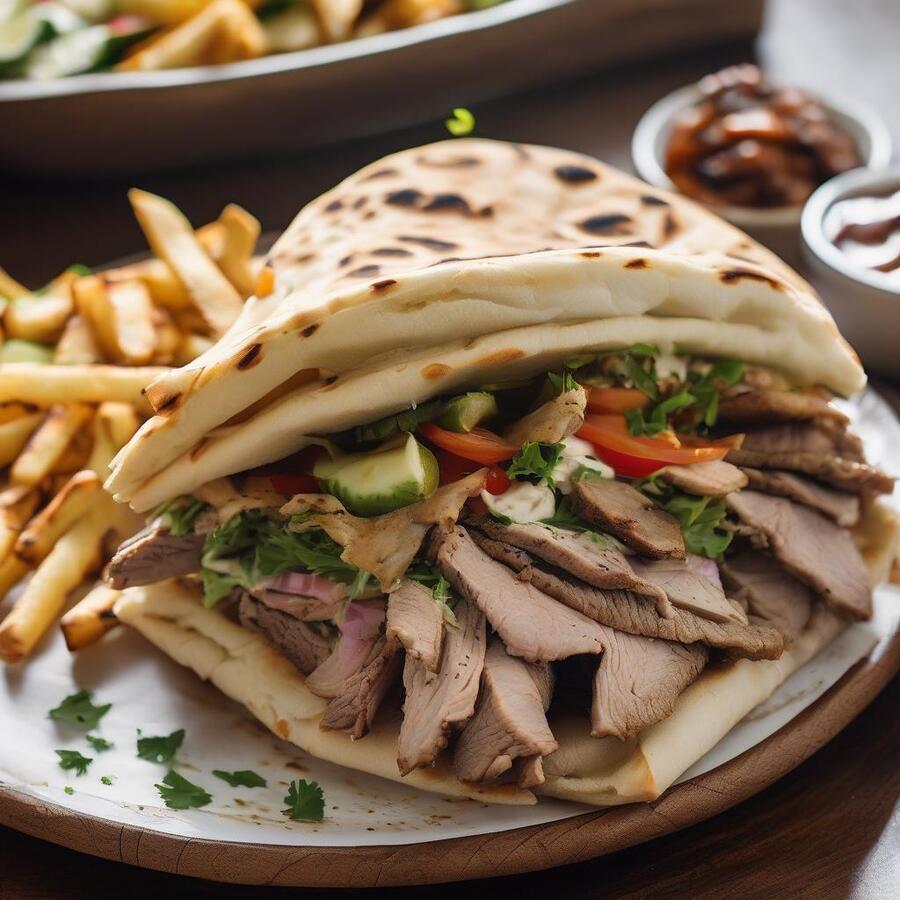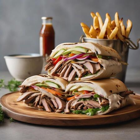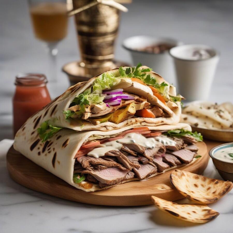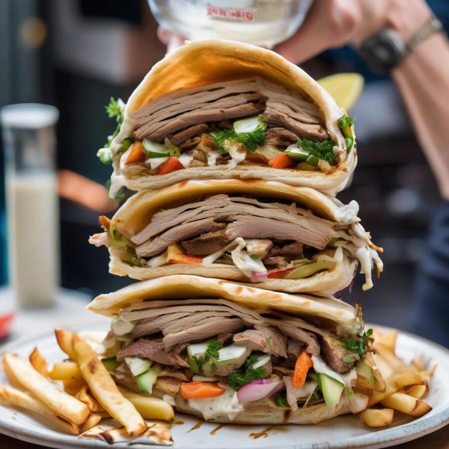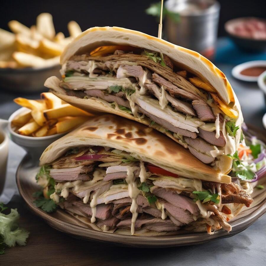Промпт: A towering shawarma sandwich stands tall on a plate, overflowing with succulent layers of thinly sliced roasted lamb, juicy chicken, and tender beef. The pita bread barely contains the abundance of meats, which are generously drizzled with creamy tahini sauce and topped with crispy fries, pickled vegetables, and a sprinkle of fresh herbs.