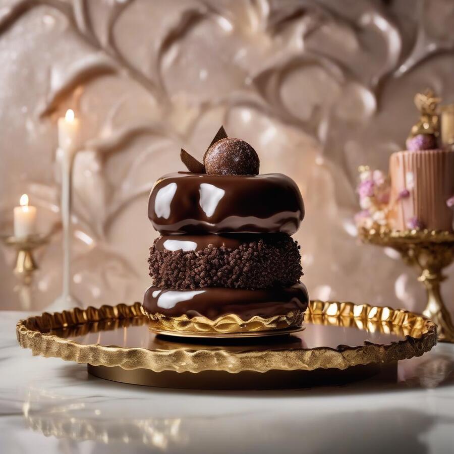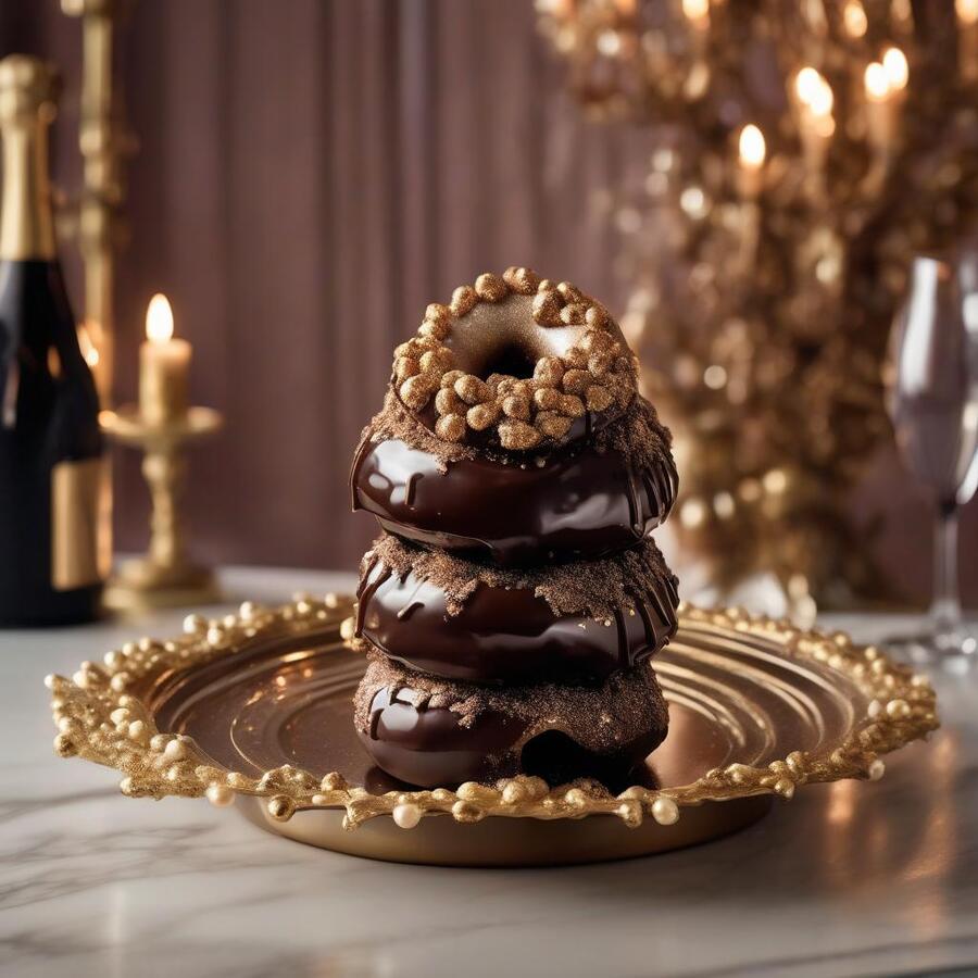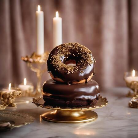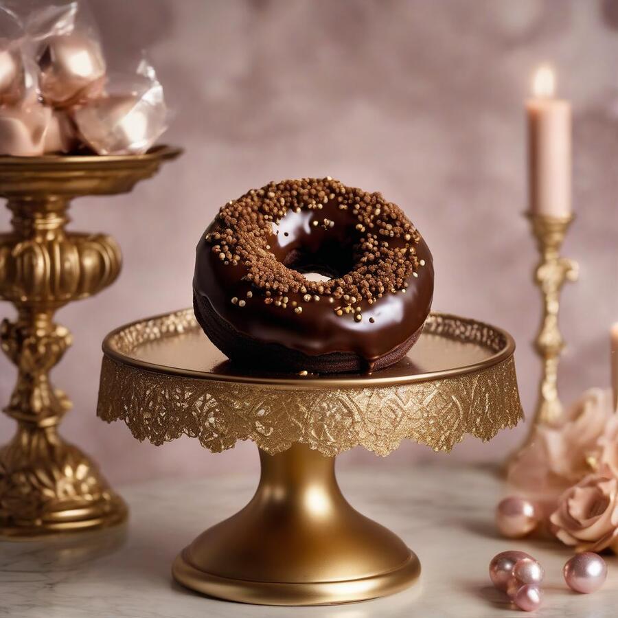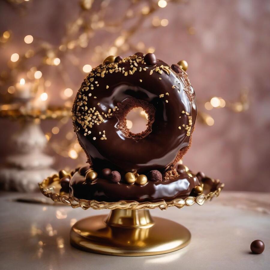 Промпт: A sumptuous chocolate donut sits temptingly on a vintage dessert stand, its glossy exterior shimmering under the soft glow of ambient lighting. Coated in a thick layer of velvety chocolate glaze, the donut is embellished with a generous sprinkling of chocolate curls, edible gold leaf, and miniature chocolate pearls. With its opulent presentation and indulgent toppings, this luxurious treat is the epitome of chocolate decadence.