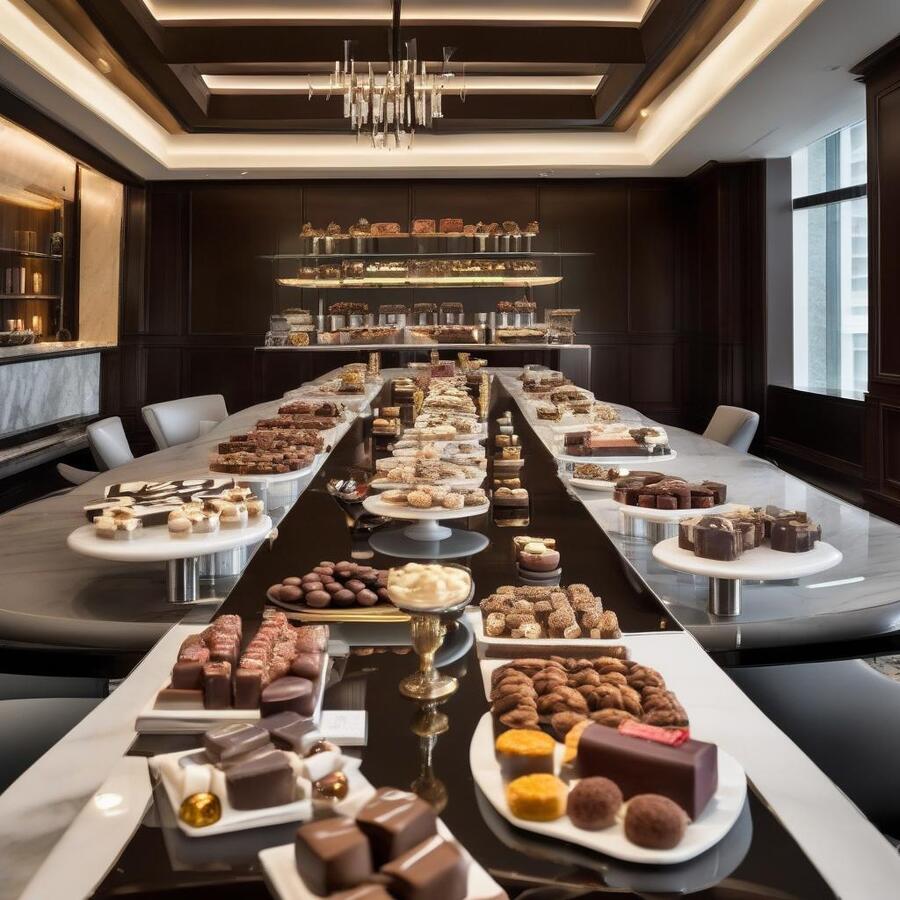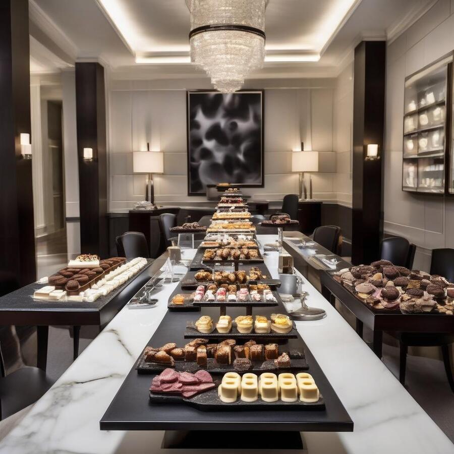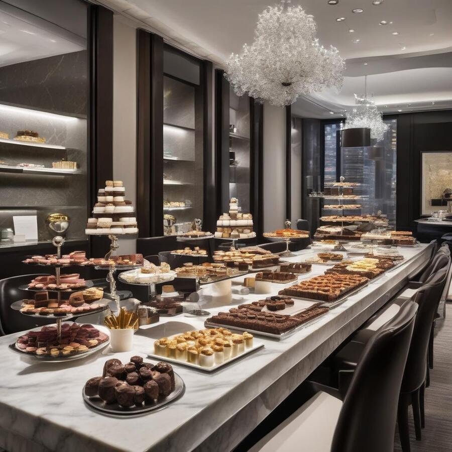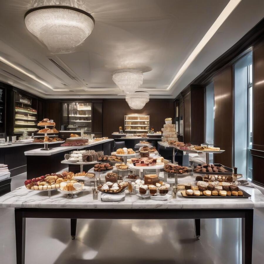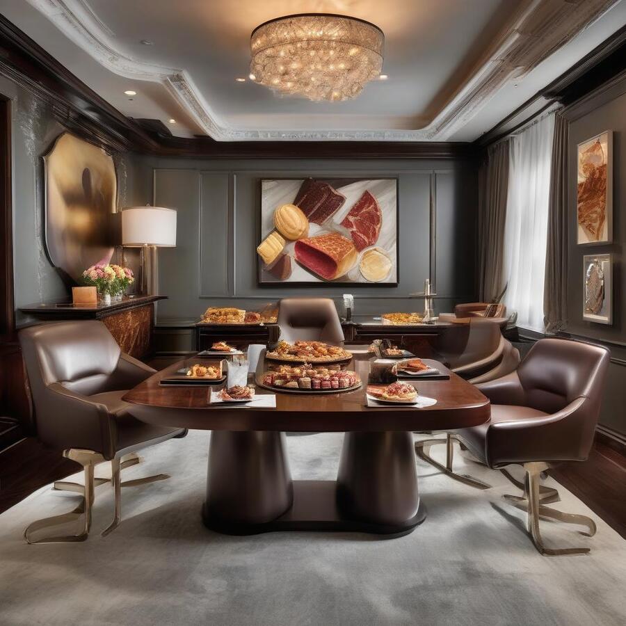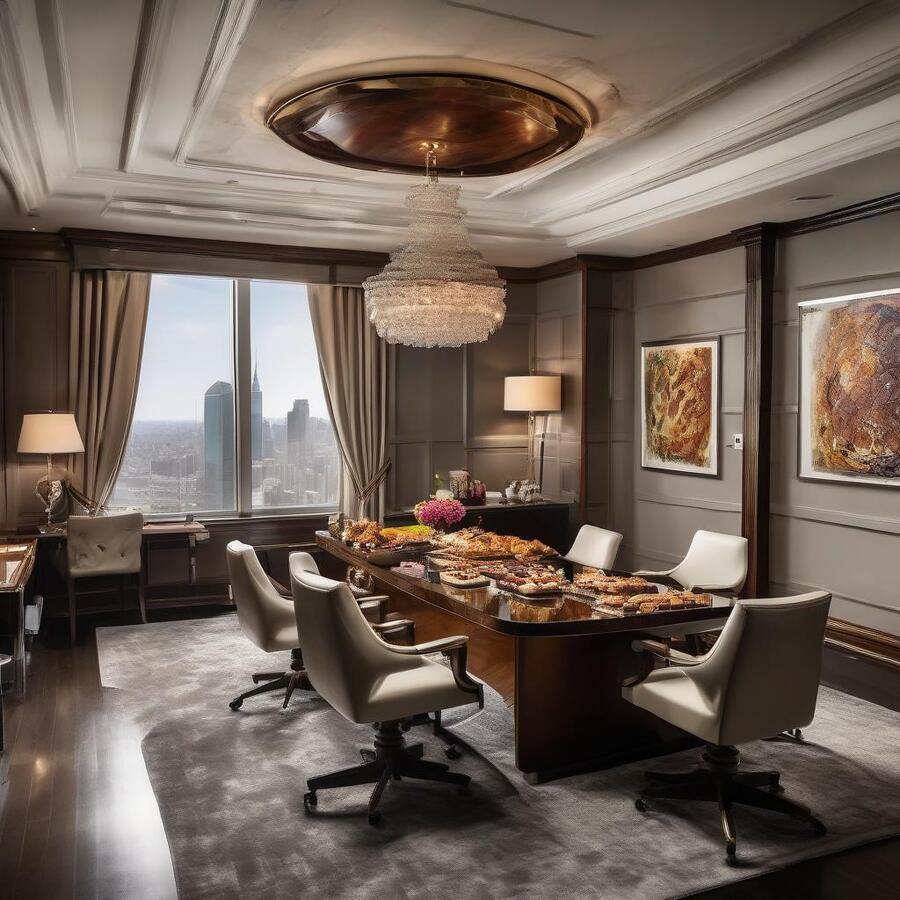 Промпт 2: The executive boardroom of a prestigious office is transformed into a culinary masterpiece, with a long marble table set with silver trays of gourmet delights. Towering tiered stands display an array of high-calorie treats, including champagne-infused truffles, artisanal charcuterie boards, and miniature éclairs filled with rich cream. Meanwhile, a sleek espresso bar offers an array of indulgent coffee creations, providing the perfect accompaniment to an afternoon of corporate decadence.