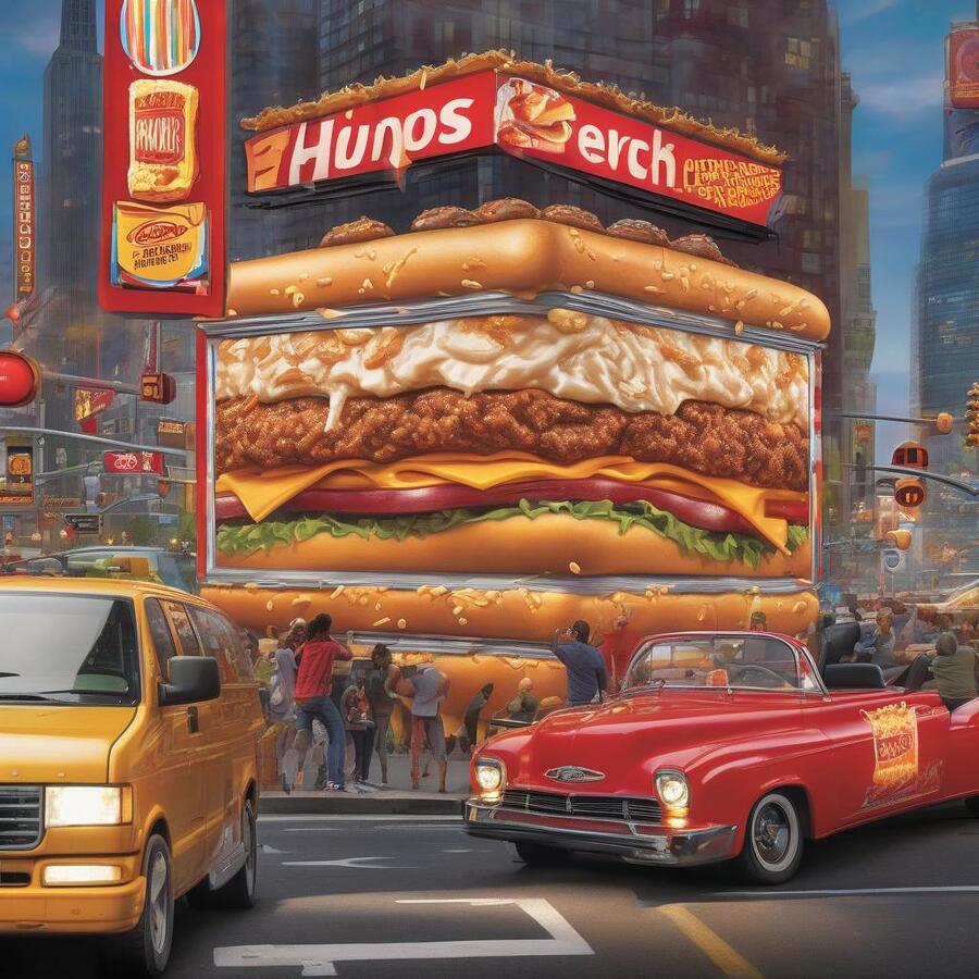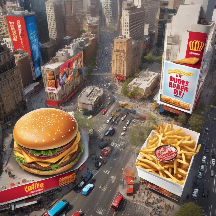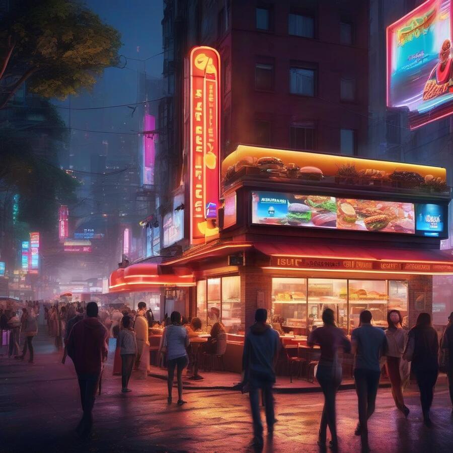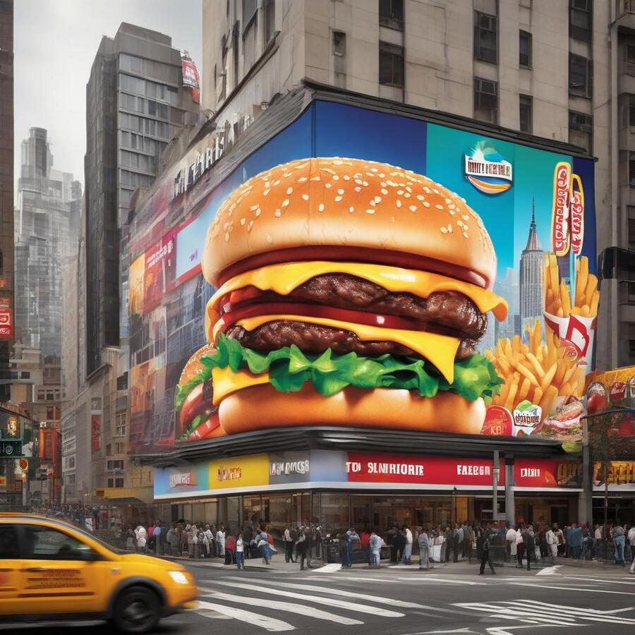 Промпт 1: Stretching across the busy intersection, an eye-catching fast-food cafe advert banner commands attention with its brilliant display of light and color. Against a backdrop of urban chaos, the banner features larger-than-life images of juicy burgers dripping with cheese, crispy chicken sandwiches, and towering milkshakes adorned with whipped cream and cherries, beckoning to hungry diners with promises of indulgence.