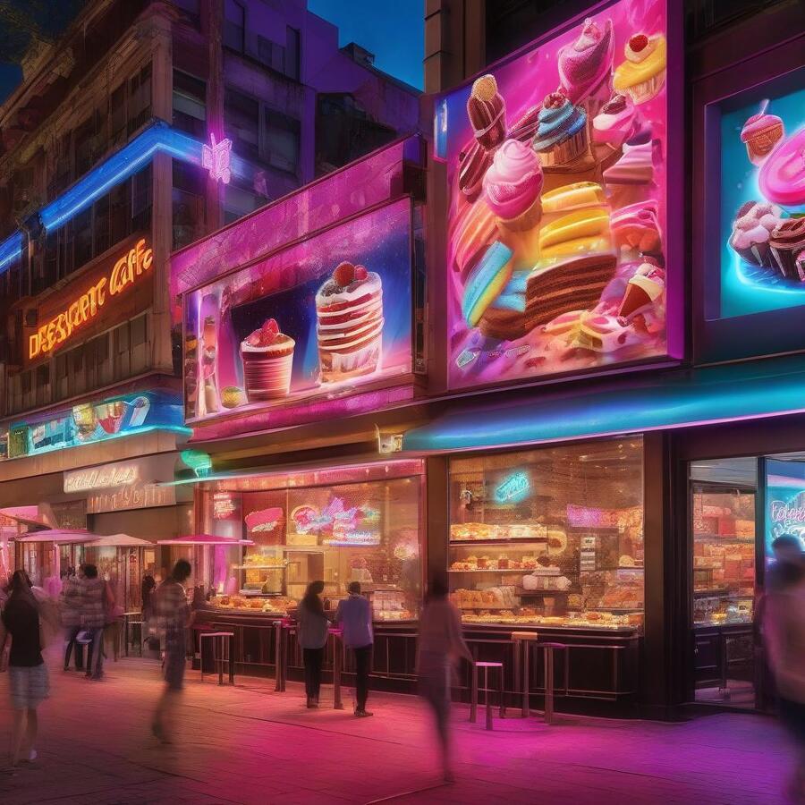 Промпт 2: A vibrant street scene is illuminated by the dazzling lights of a dessert cafe advert, which dominates the skyline with its eye-catching display. Neon signs and LED screens flicker and glow, showcasing tantalizing images of decadent desserts and colorful confections that beckon passersby to indulge in a sweet escape.