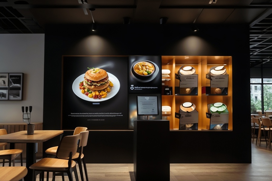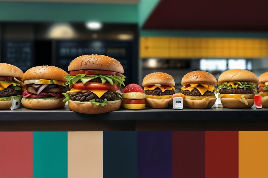 The color palette of the fast-food cafe is bold and vibrant, with shades of rich reds, golden yellows, and indulgent browns dominating the interior decor. These warm, inviting colors evoke the savory flavors of the high-calorie dishes served, creating an atmosphere of comfort and indulgence for diners.