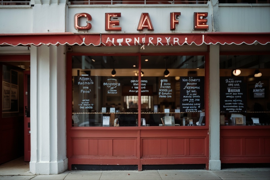 Media: Large LED screens adorn the walls of the cafe, displaying mouthwatering images and videos of the decadent dishes on offer. Dynamic animations and enticing visuals draw the attention of passersby, enticing them to step inside and indulge in the high-calorie delights awaiting them. Additionally, upbeat music fills the air, creating a lively and energetic atmosphere that enhances the dining experience.