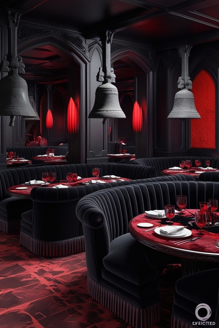 The restaurant features luxurious black velvet sofas and oak chairs with Gothic carvings, stone bells as lamps emitting an eerie glow, and red accents highlighting the dark, mysterious ambiance.