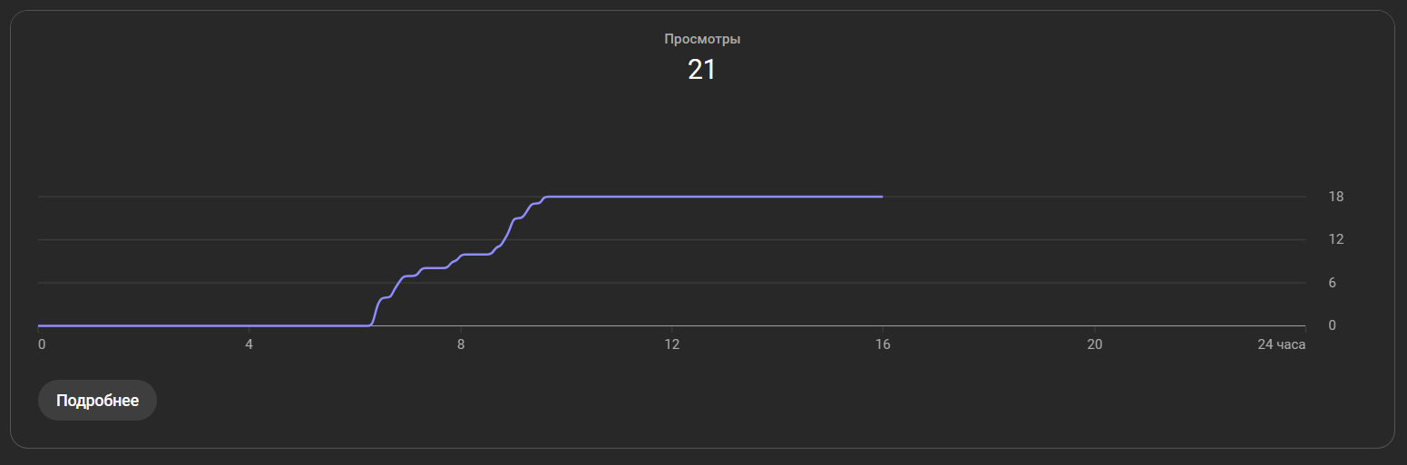 • YouTube Shorts показал критически низкий охват: 21 просмотр — это сигнал о серьезной проблеме в дистрибуции или привлекательности контента для алгоритма/аудитории, несмотря на неплохой процент вовлечения (15.8%)
