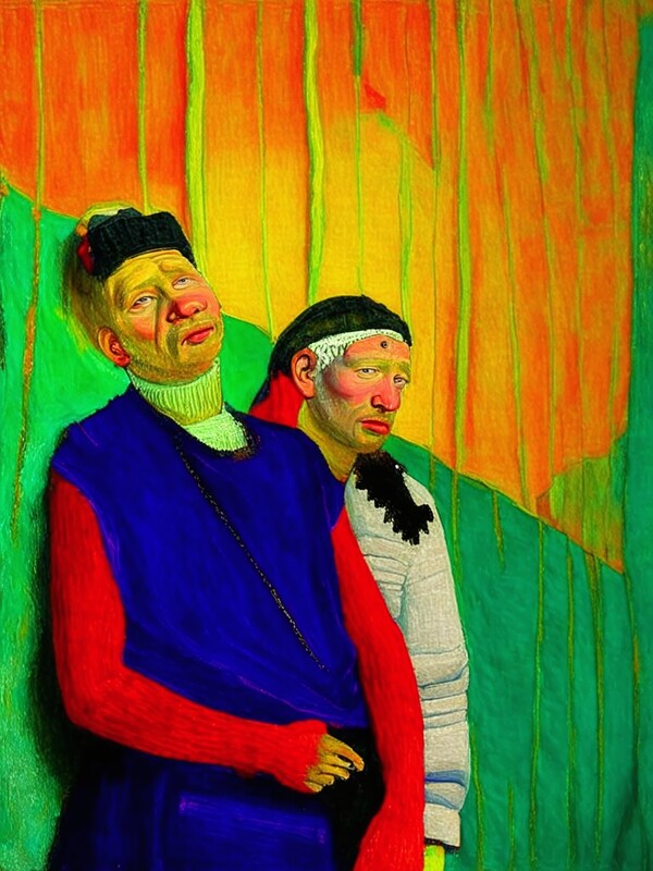 Kandinsky: генеративное наложение стиля с картины Ван Гога «Автопортрет с отрезанным ухом и трубкой» на фотографию дуэта «калиостро»