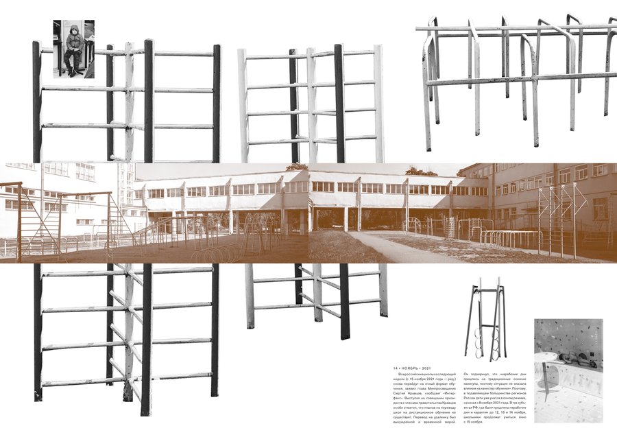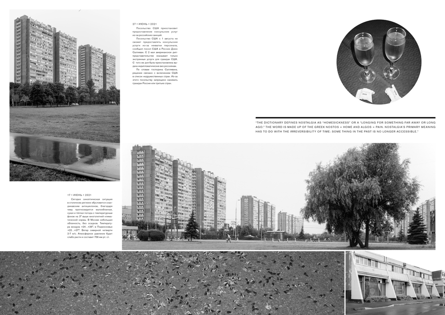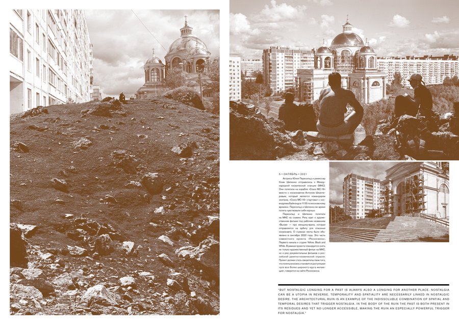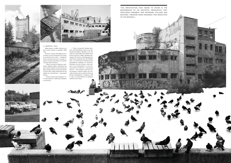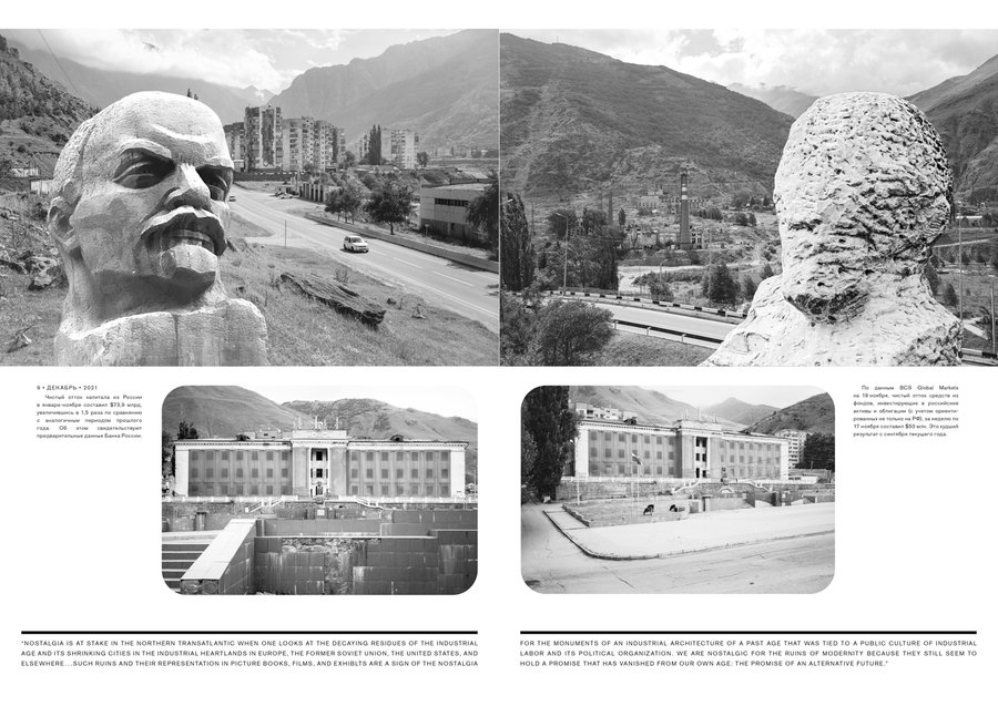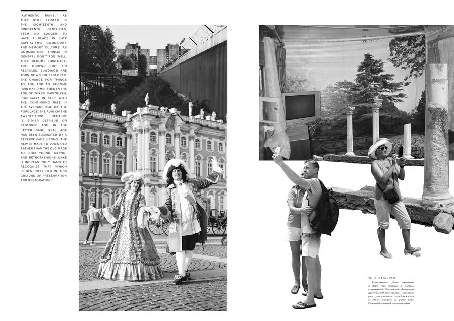 Фотографии конструктивистской архитектуры 1930-х годов, использованные в журнале, содержат следы коммунистической идеологии, а их сохранение в состоянии постепенного разрушения или обновления подчеркивает их историческую значимость. Эти руины представляют собой ностальгический фон российской действительности, незримо присутствующий и влияющий на нее.