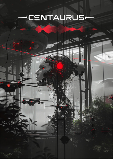 «A minimalistic logo of a stealth-shooter game about future, cyborgs and sounds named „CENTAURUS“, depicting black hostile robotic horse head with red eyes on background of electrical circuits and sound waves»