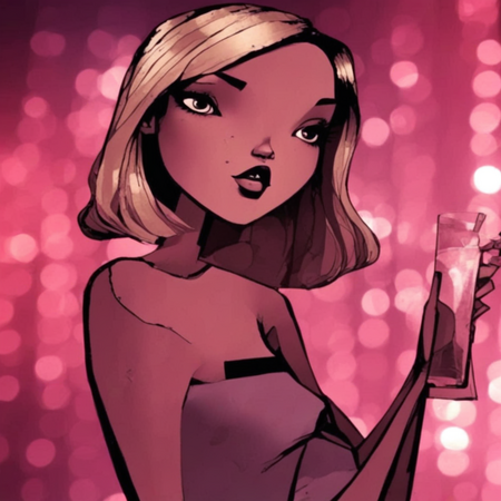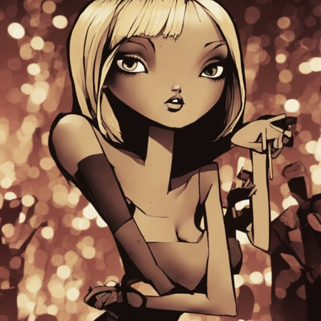 Первые сгенерированные в модели картинки поразили меня качеством стилизации. Нейросеть действительно справилась со сложными приёмами и верно исказила пропорции персонажей. На всех представленных картинках можно заметить уместные градиентные тени и черные заливки, которые часто применяет Роберт Вэлли, а также стройные угловатые силуэты с тонкими руками. Даже фон изображений очень похож на то, как Роберт Вэлли рисует ночной город и блики света. Меня впечатлило, как нейросеть справилась со структурой лиц у персонажей: ставила тени и блики на переходах между гранями лица, при этом учитывая сложную форму головы, расстановку черт лица, создавая очень четкую и читаемую иллюстрацию. Даже такая едва заметная деталь, как изменения толщины контура, реализовалась с успехом: это особенно заметно на волосах персонажей, где очень четко разделяются пряди, присутствует блик в нужном месте.