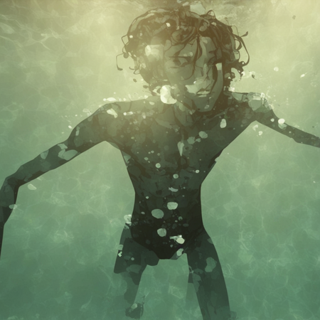 prompt: a boy in swimsuit flowing in water depths, no other objects