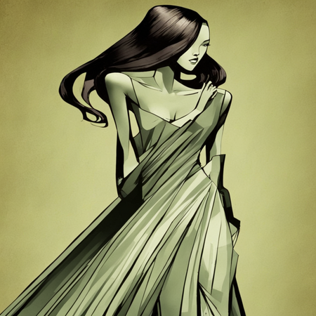 Конечно, нейросеть не идеально справляется с отрисовкой предметов, которых не было в изначальном сете. Например, я задала в промпте изобразить букет цветов, и на итоговом изображении эта деталь заметно выбивается из общего визуала. Тем не менее, букет явно выполнен с соблюдением основных принципов стиля: четкие контуры, черные заливки вместо теней. И, конечно же, на всех изображениях присутствуют сильные проблемы с отрисовкой кистей рук. На этом моменте появляется очень много артефактов, от которых нельзя избавиться. Причиной этому может быть как недостаток исходников с разными позами рук, так и общее неумение нейросетей реализовывать столь сложный объект.