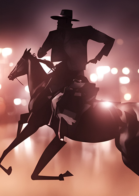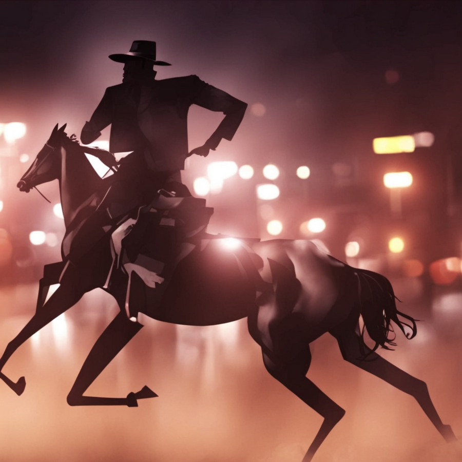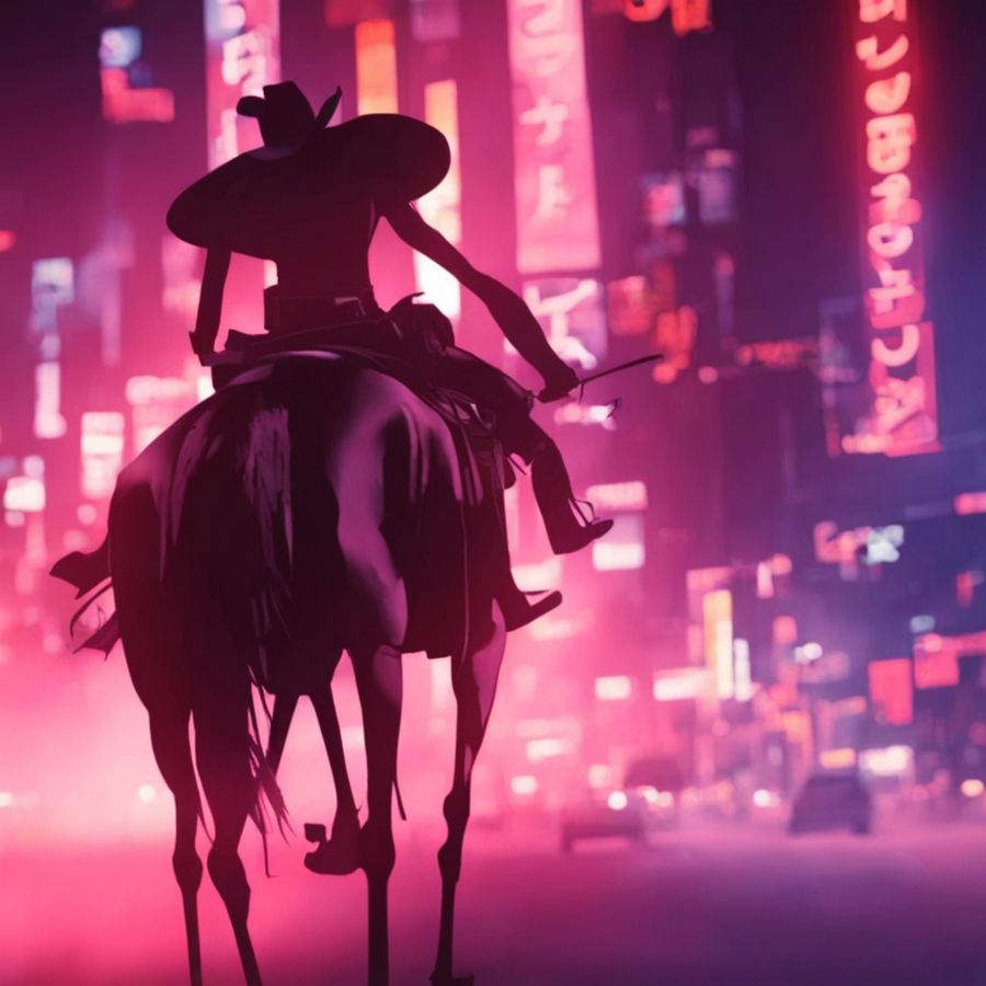 prompt [1]: portrait of cool cowboy in a hat riding a horse in city lights // prompt [2]: a gangster riding a fast horse through the night lights