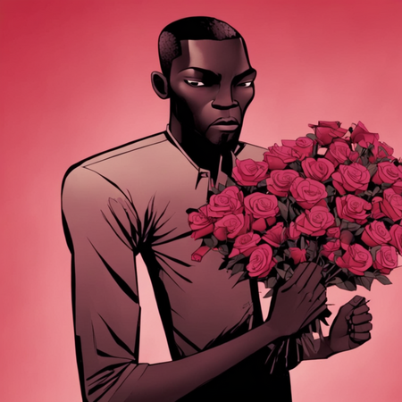 prompt [1]: a girl in an elegant long dress with stylish haircut // prompt [2]: black-skinned man holding a bouqet of rose flowers with a serious face