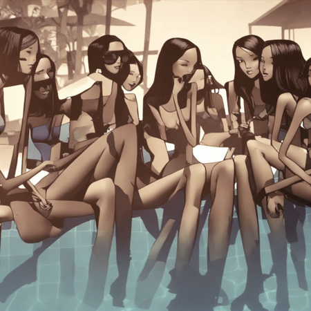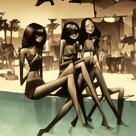 prompt[1]: a group of girls sitting by the pool in summer // prompt [2]: a group of 2 girls sitting by the pool in summer
