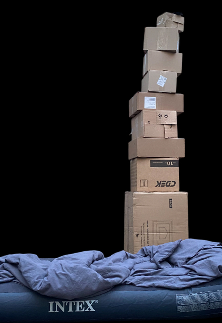 Особенно уязвимым чувствует себя человек без устоявшегося домашнего пространства. Инсталляция состоит из вещей, ассоциирующихся с переездом. Вместо кровати — надувной матрас, вместо прикроватных тумбочек — картонные коробки. Надежное сменяется слабым, временным.