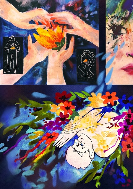 Две странички комикса посвящены разным сторонам переживаний героини. Первая — более личная, субъективная; она о внутреннем мире девушки, который переполнен образами, красками, волнениями. Кажется, что чувствовать сильнее и больше уже невозможно: в один момент в ее душе умещается целая вселенная, которая разрывает от эмоций изнутри. И я вижу эту вселенную прекрасной.