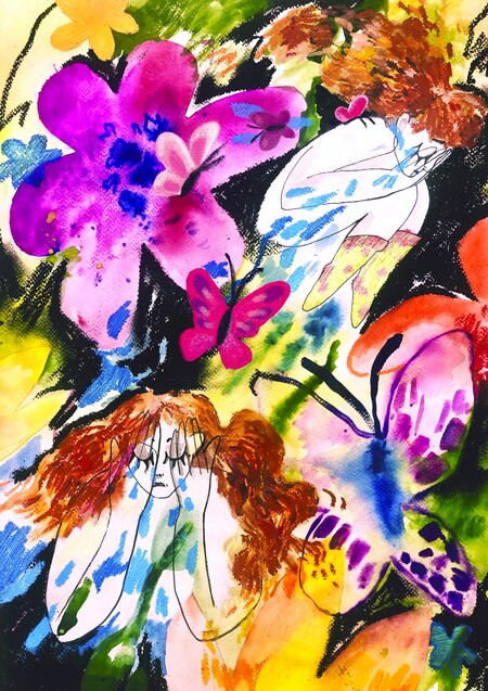 Вторая страница — как бы взгляд на историю вовне. Тут героев уже двое, и рассказ обретает, хоть и метафорично, свой логичный сюжет о встрече и расставании. Страницы рифмуются потеками слез и активными композиционными диагоналями, а также очень яркой цветовой гаммой. Юность, красота и чистота красок и эмоций, весенняя атмосфера и искренность — главный мотив этой серии.