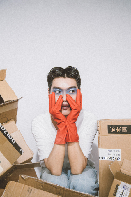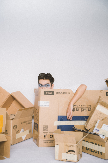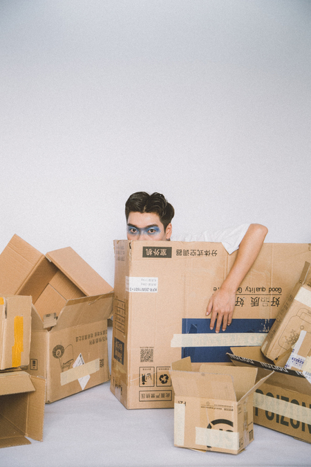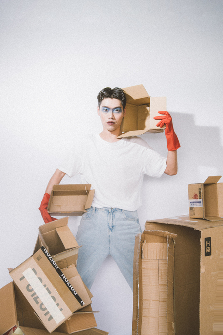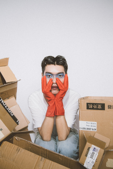 This set of works constructs a field of «cleaning up the ruins of consumer society» using abandoned express delivery boxes as narrative symbols. The color of eye shadow is inspired by the fact that when observing the earth from space, the earth mainly presents blue, which symbolizes that human beings see the blueprint of protecting the environment. The red plastic gloves represent the cleaning work of human intervention in the environment, forming a cold and warm contrast with the blue eye shadow, forming a metaphor of «seeing-action». The stacked cardboard boxes point to the excessive packaging of the consumer era, and the model show an expressionless state of resting, carring, and thinking in the cardboard boxes. This set of photographic works aims to convey the environmental concept of «coexistence of destruction and restoration», calling on people to reconstruct the balance between humans and nature through action.