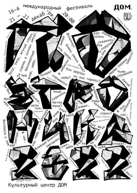Специально для плакатов к фестивалю современной поэзии, саунд-арта и саунд-дизайна Поэтроника 2022 был создан кубофутуристичный акцидентный шрифт с искажённой геометрией, подражающий пластике «Герники» Пабло Пикассо. Во втором плакате я стремилась повторить дробный характер шрифта с помощью малярного скотча.