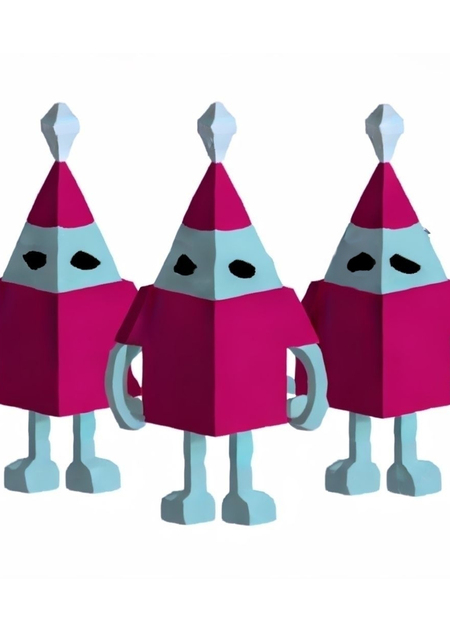 Промпт: 3 different charachters made from simple geometrical shapes riding rollers on a white background