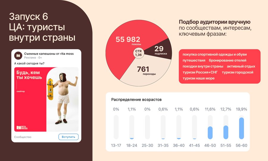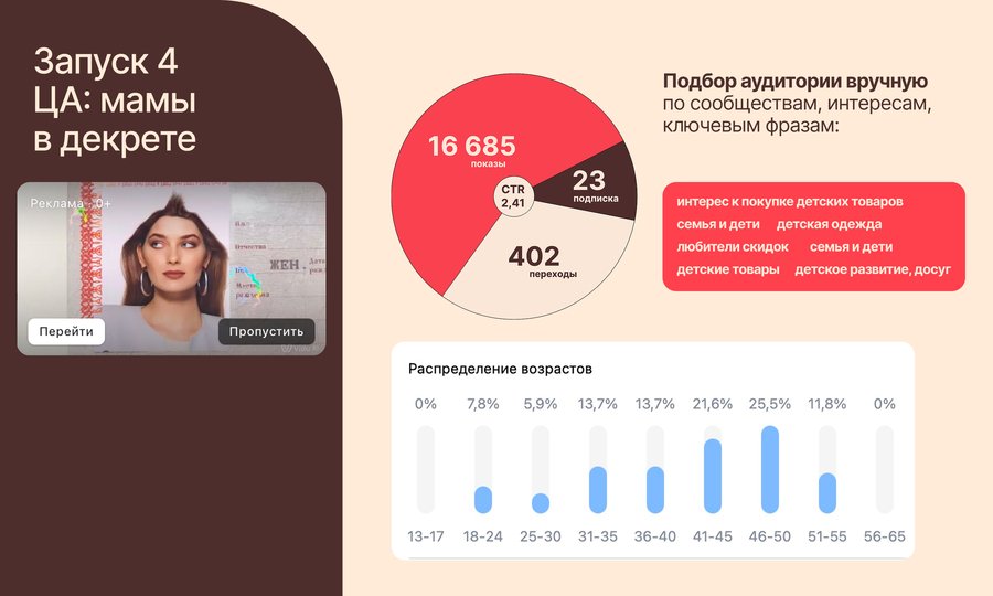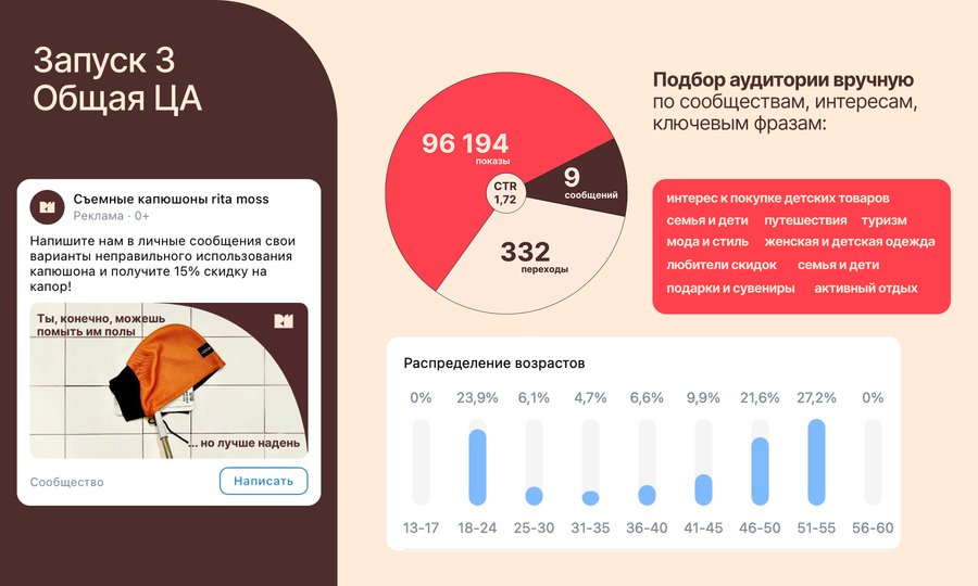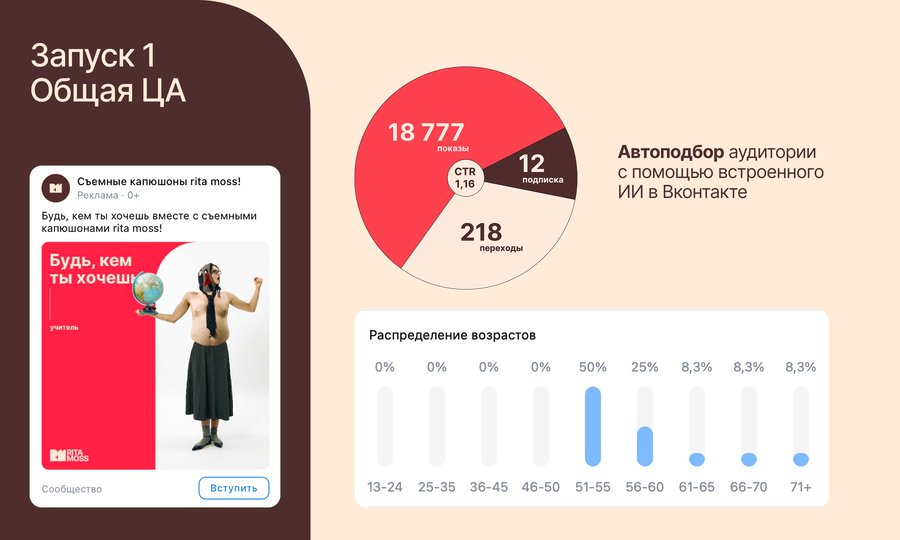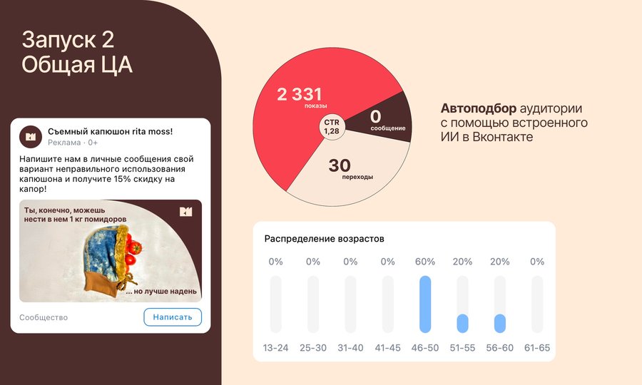 Вывод: при несовершенных алгоритмах ВК, креатив уверенно перегоняет 1% CTR = образное решение лидирует. При этом совмещение релевантного для сегмента ЦА образа с настройками вручную приводит к многократному росту кликабельности