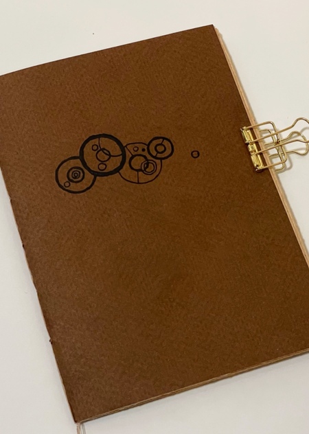 Про материалы: для обложки использована пастельная бумага, для блока — Canson Sketch 120 г/м^2, состаренная чаем. Письмо и рисунки выполнены акварелью цвета кость жженая.